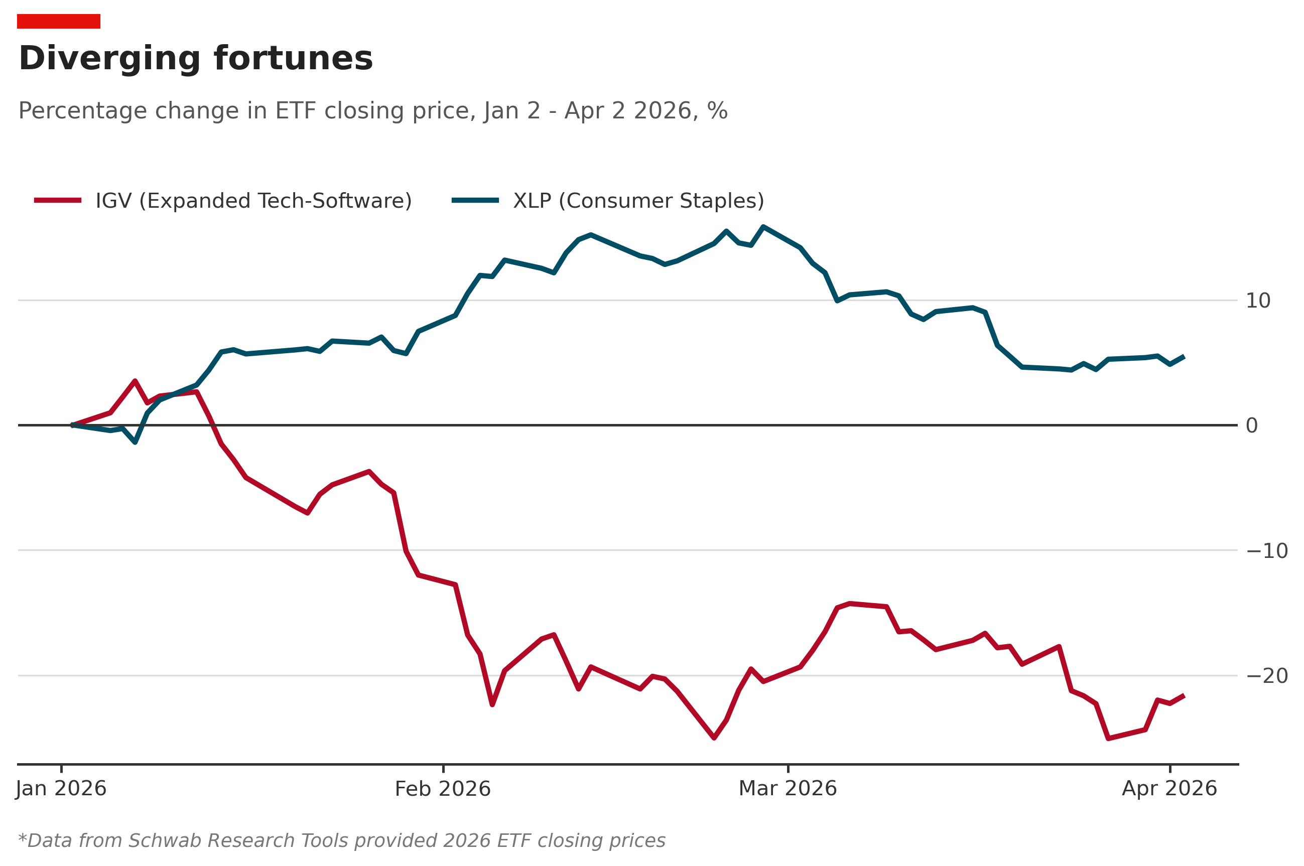 图 1:IGV vs XLP相对收益对比,2026年1月至4月